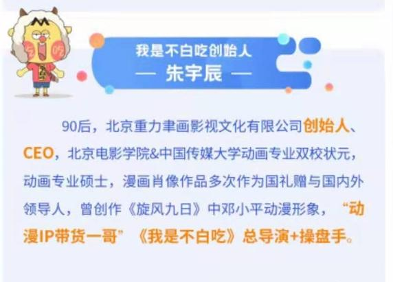 总结来说,第一是行业第一个原创动漫虚拟主播带货,行业首创了虚拟主播+真人助理的搭配模式,并成为一个用AR实现多场景切换;第二是有趣、有用、有文化的短视频带货IP,将令人垂涎三尺的美食和底蕴深厚的传统文化巧妙融合;第三是用做品牌的方式经营IP,实现品效合一,助力销售,“我是不白吃”非常注重复购率,精心选品,一开始就建立了强供应链和运营团队。另外,其创始人朱宇辰也是科班出身,一直在动画行业久负盛名,所以操盘出动画带货一哥也是题中之义。